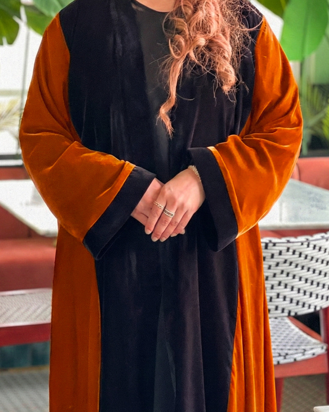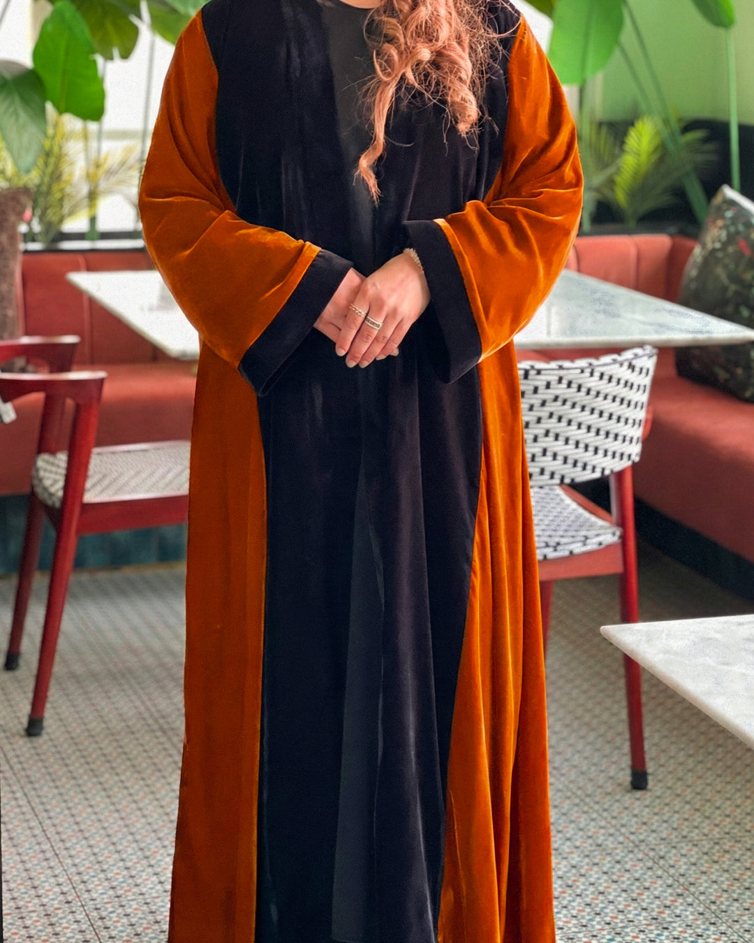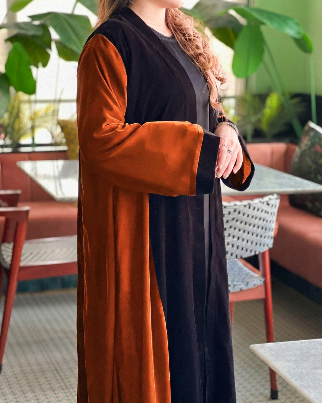 Our Amber Twilight gown, crafted in premium soft velvet, envelops you in a warm, radiant glow with its lush texture and seamless drape. The vibrant rust and black color-block design brings a spirited yet sophisticated charm, creating a striking silhouette that stands out effortlessly. Perfect for autumn festivities or evening galas, this gown ensures you look radiant, graceful, and unmistakably confident.