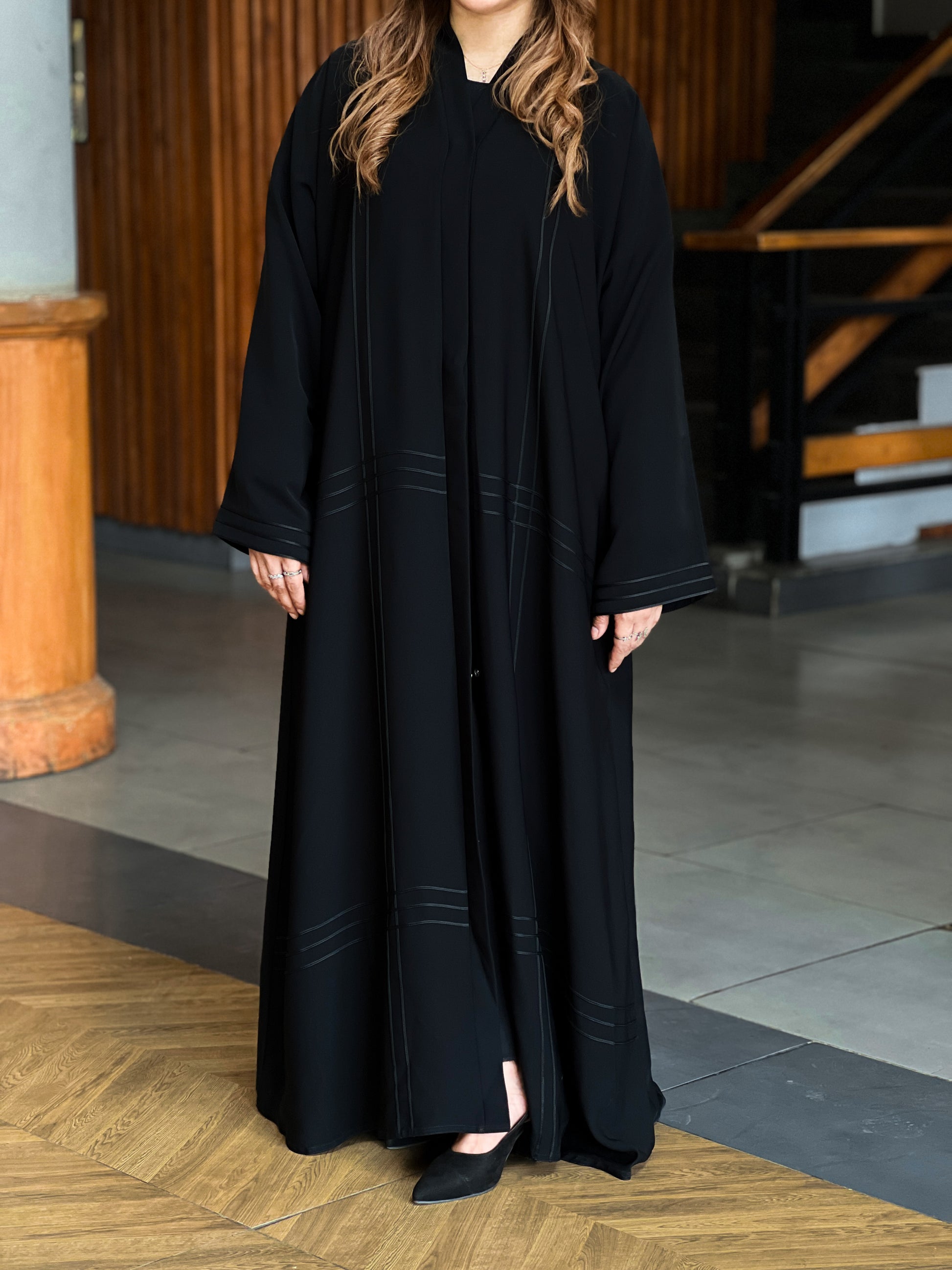 Elegantly tailored from authentic imported Korean Nida fabric, this all-black abaya features a sleek silhouette, elevated by linear print detailing across the front and lower panels.