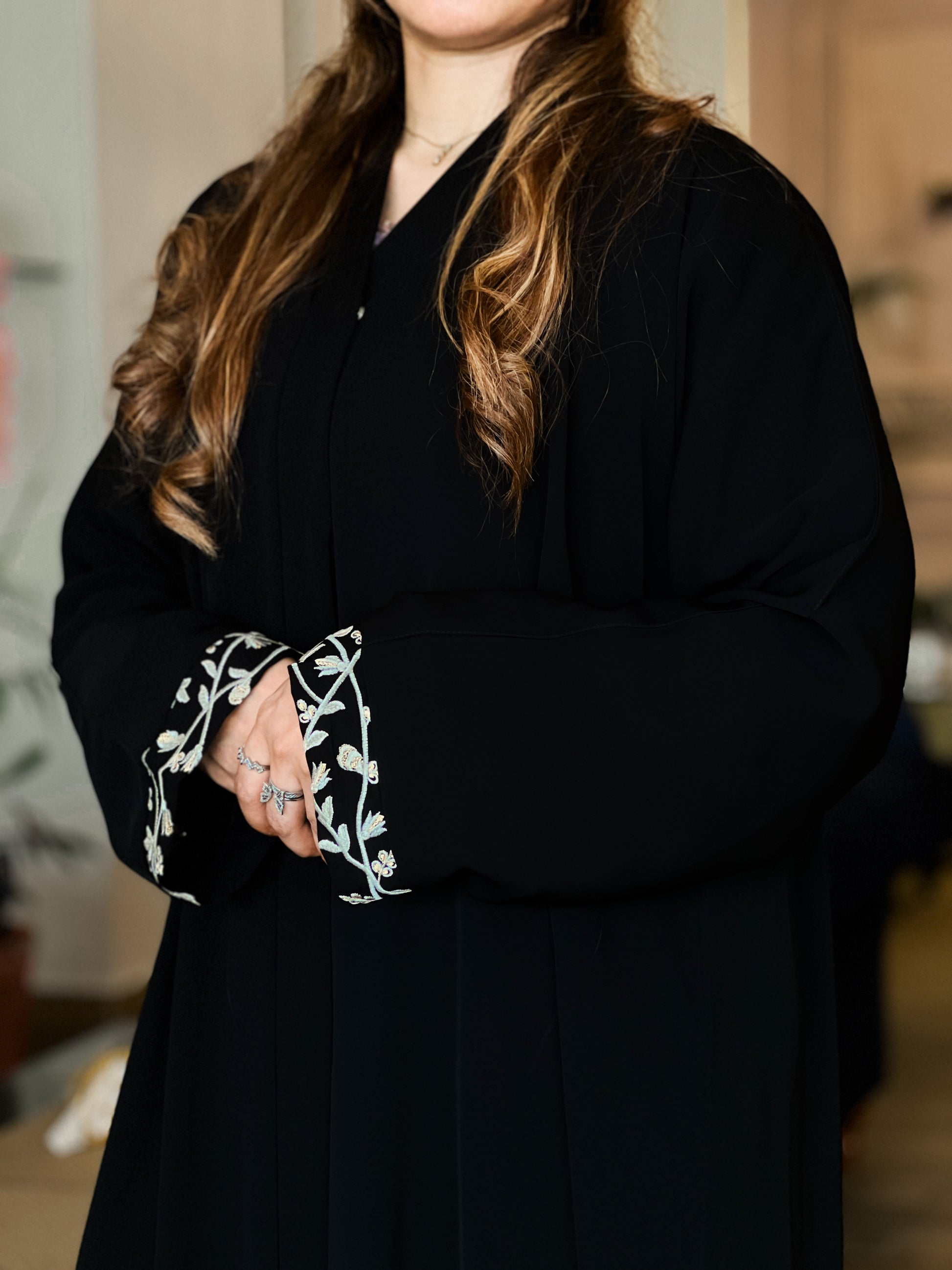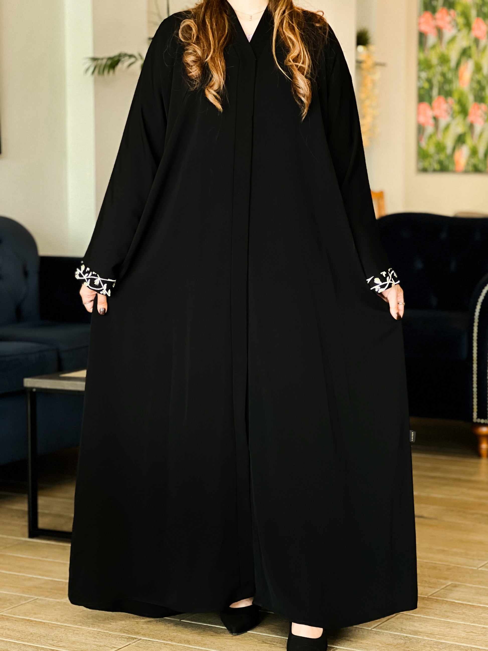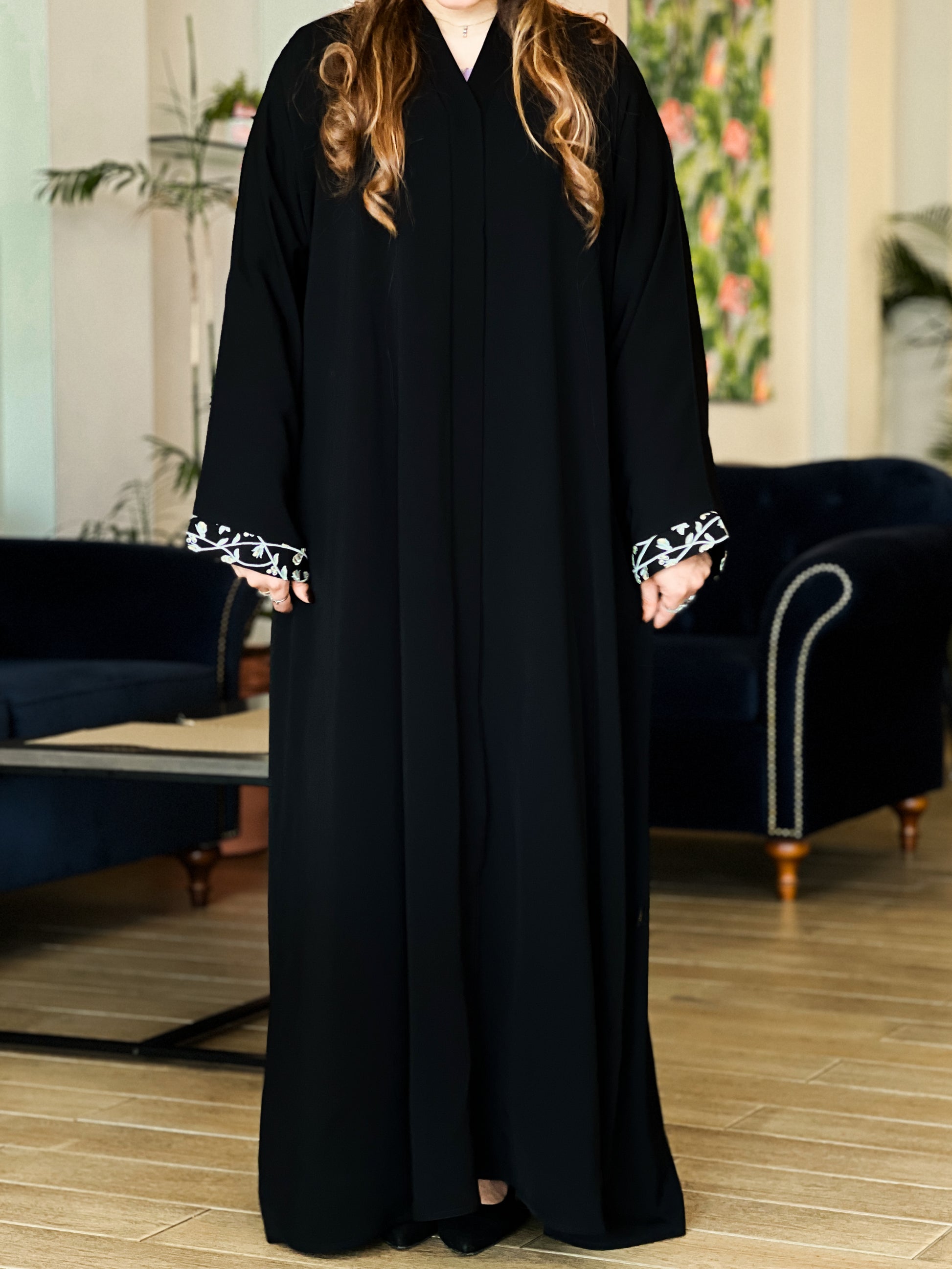 Crafted from soft, flowy authentic Korean Nida fabric, this black abaya features white embroidery on the sleeves and a delicate floral motif cascading down the back.