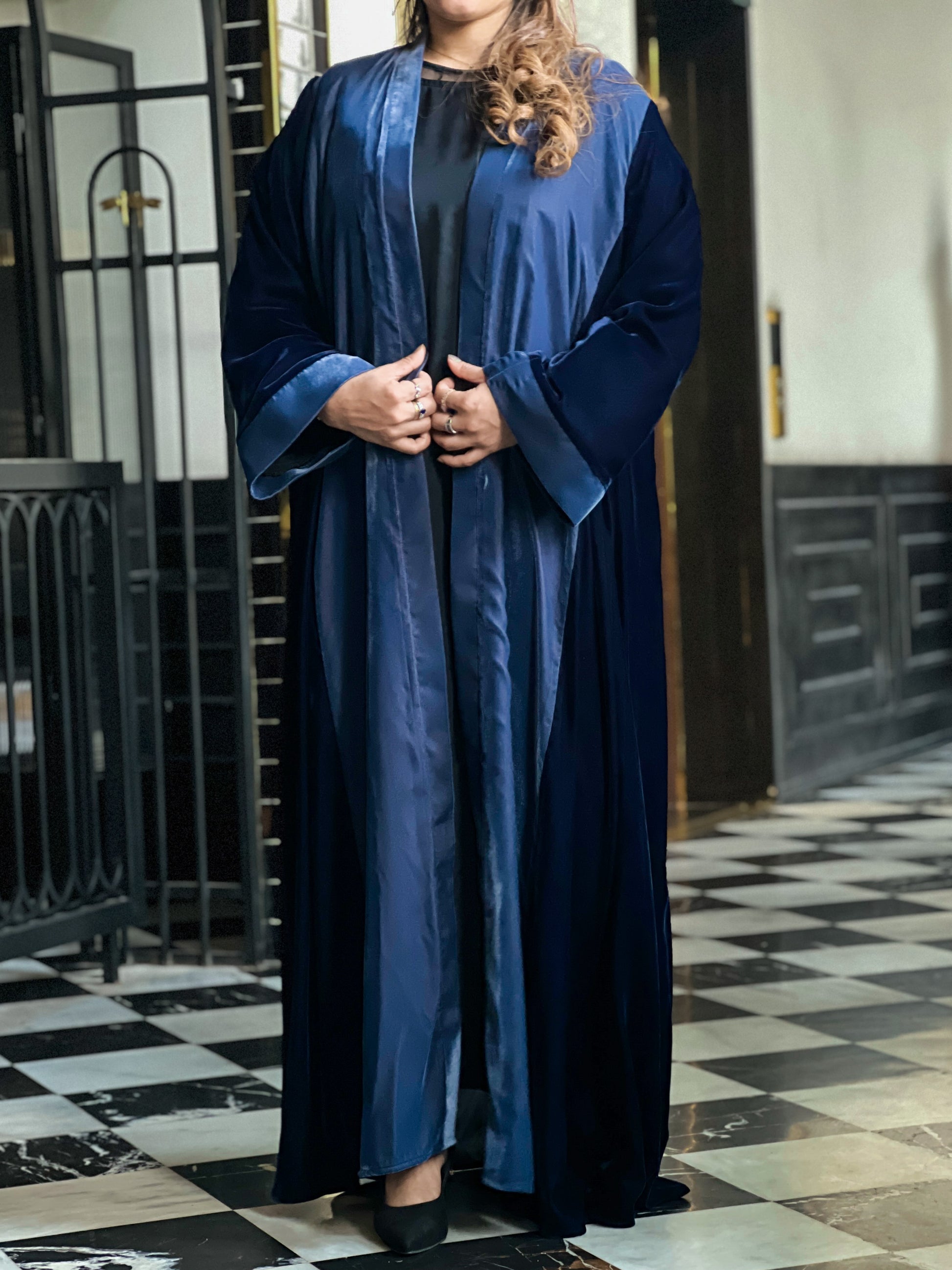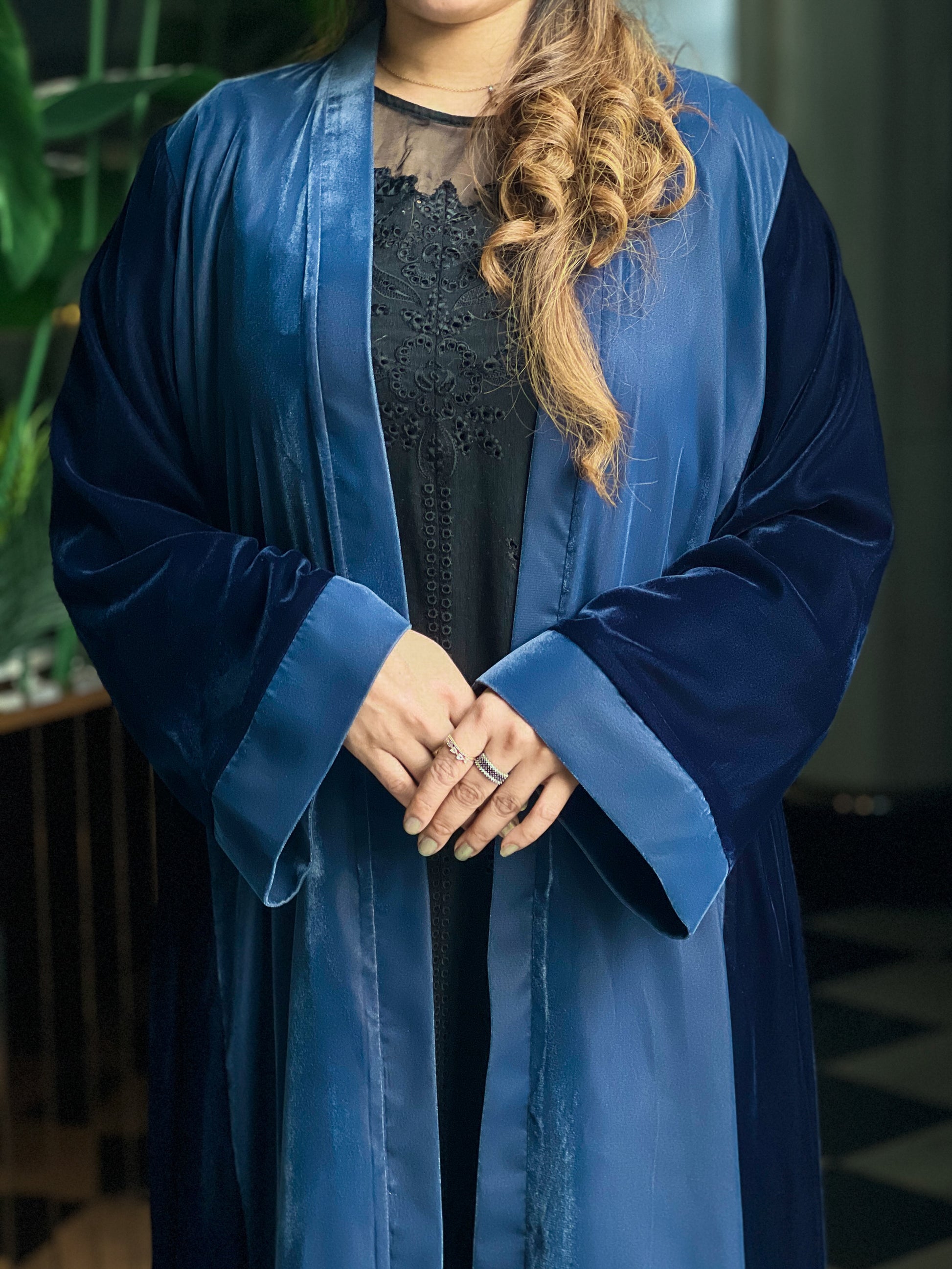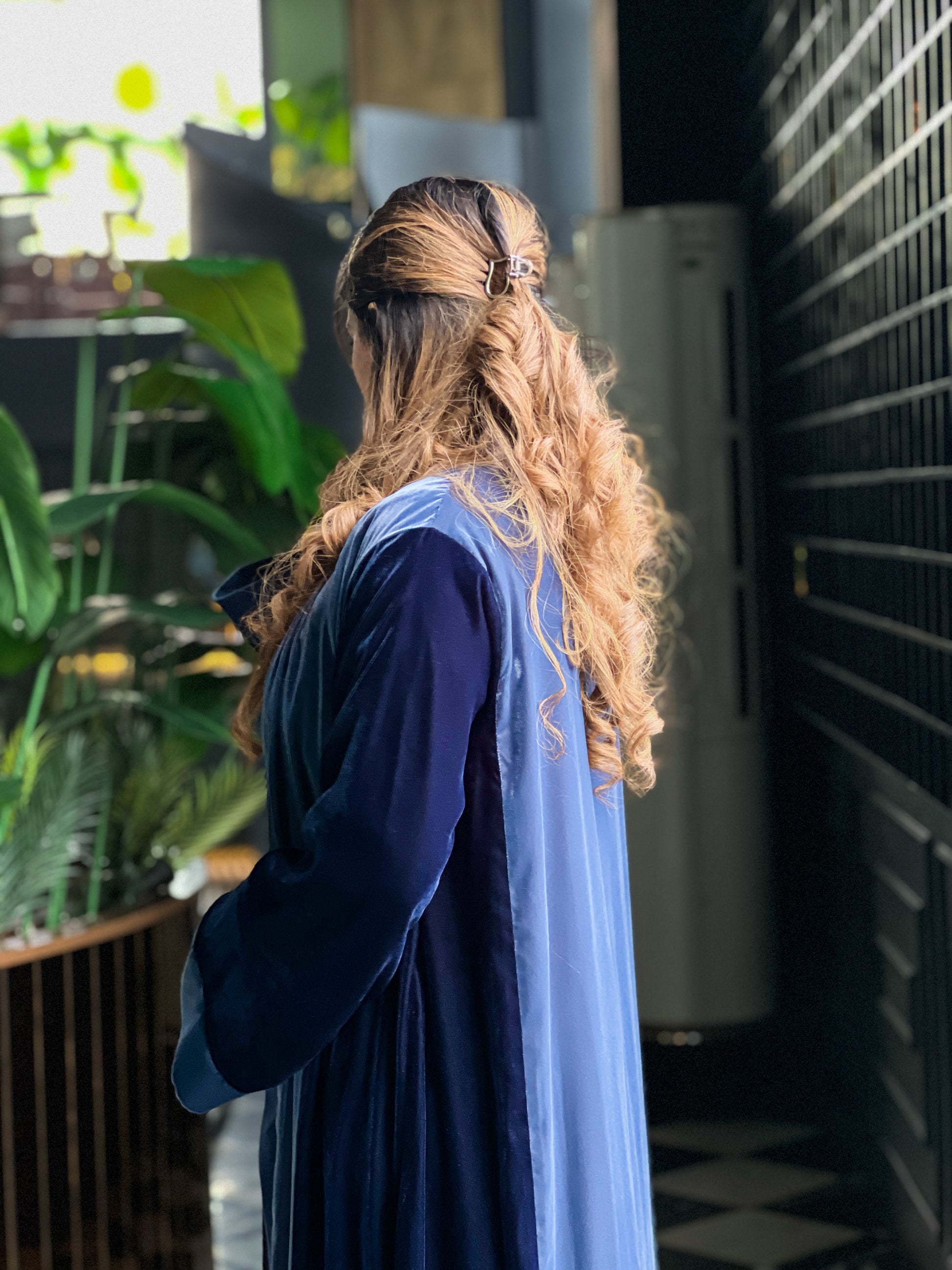 Our Royal Haze gown, tailored in luxurious all-over velvet, delivers a plush, velvety softness and a heavy, sophisticated drape that ensures warmth and comfort. The captivating interplay of royal blue and deep black creates a rich, dual-tone aesthetic, while the wide sleeves and open-front cut offer a silhouette of modern royalty. Ideal for high-profile winter soirées or wedding dinners, this gown wraps you in an aura of mystery, making you feel poised, majestic, and effortlessly chic.