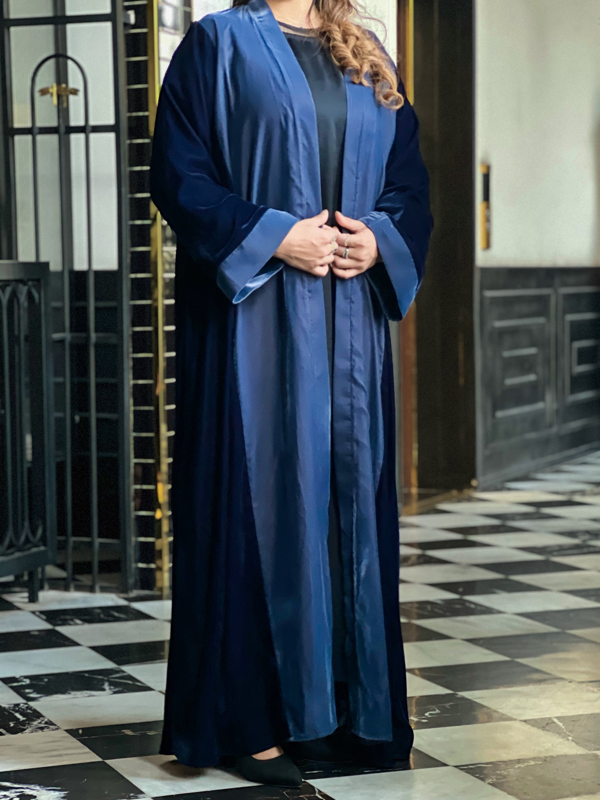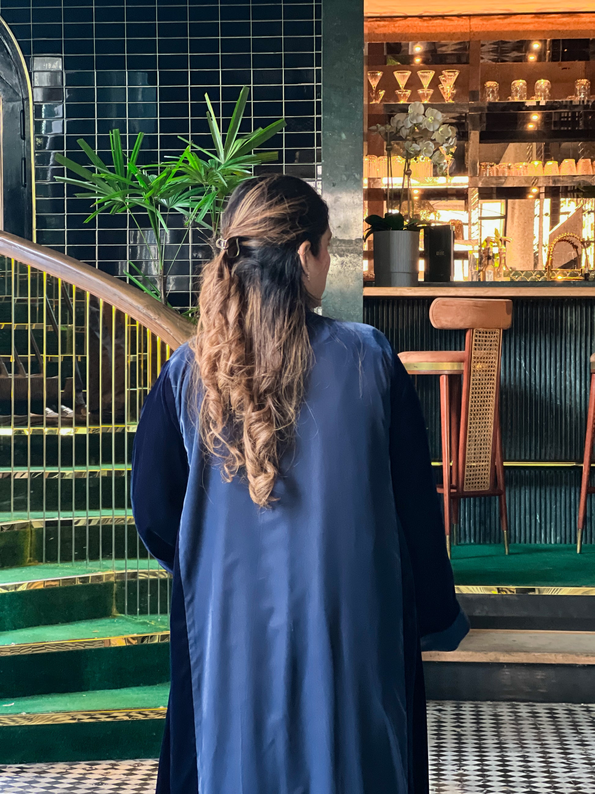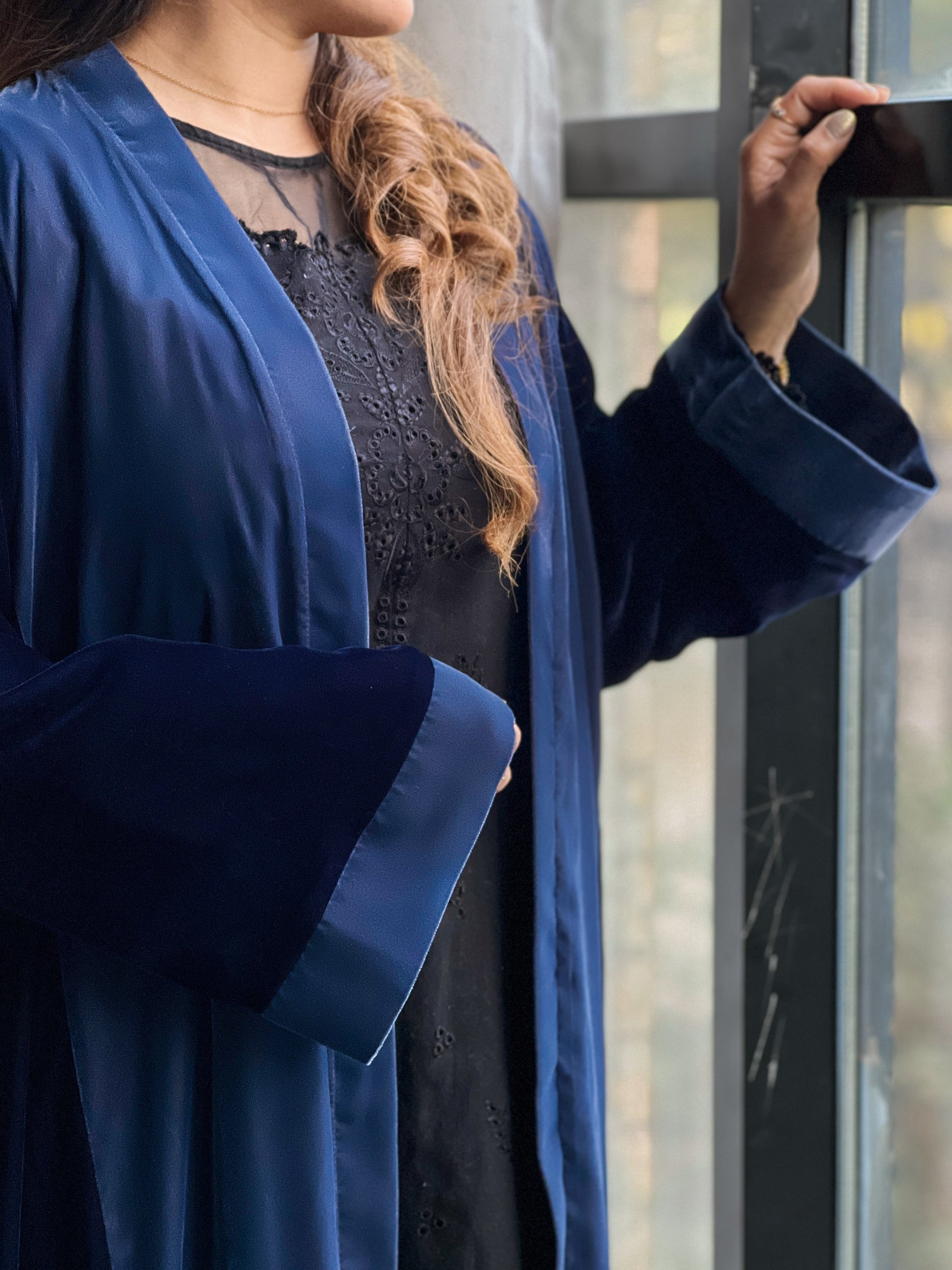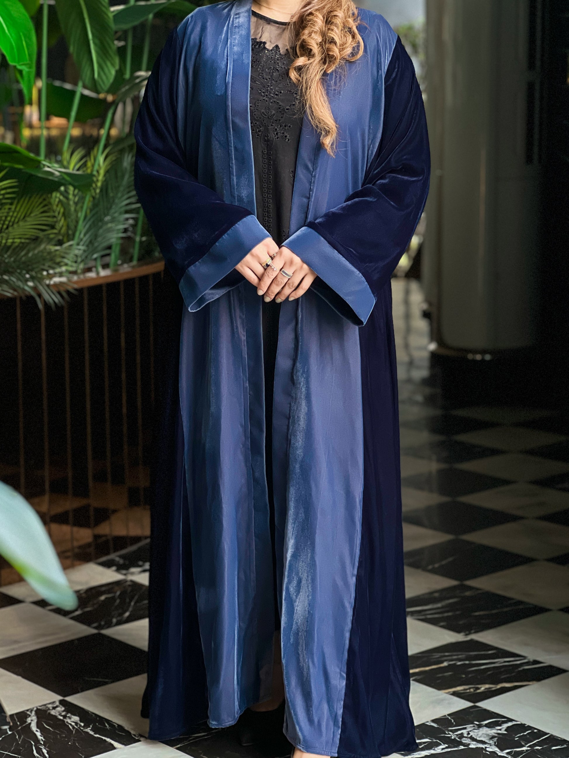 Our Royal Haze gown, tailored in luxurious all-over velvet, delivers a plush, velvety softness and a heavy, sophisticated drape that ensures warmth and comfort. The captivating interplay of royal blue and deep black creates a rich, dual-tone aesthetic, while the wide sleeves and open-front cut offer a silhouette of modern royalty. Ideal for high-profile winter soirées or wedding dinners, this gown wraps you in an aura of mystery, making you feel poised, majestic, and effortlessly chic.
