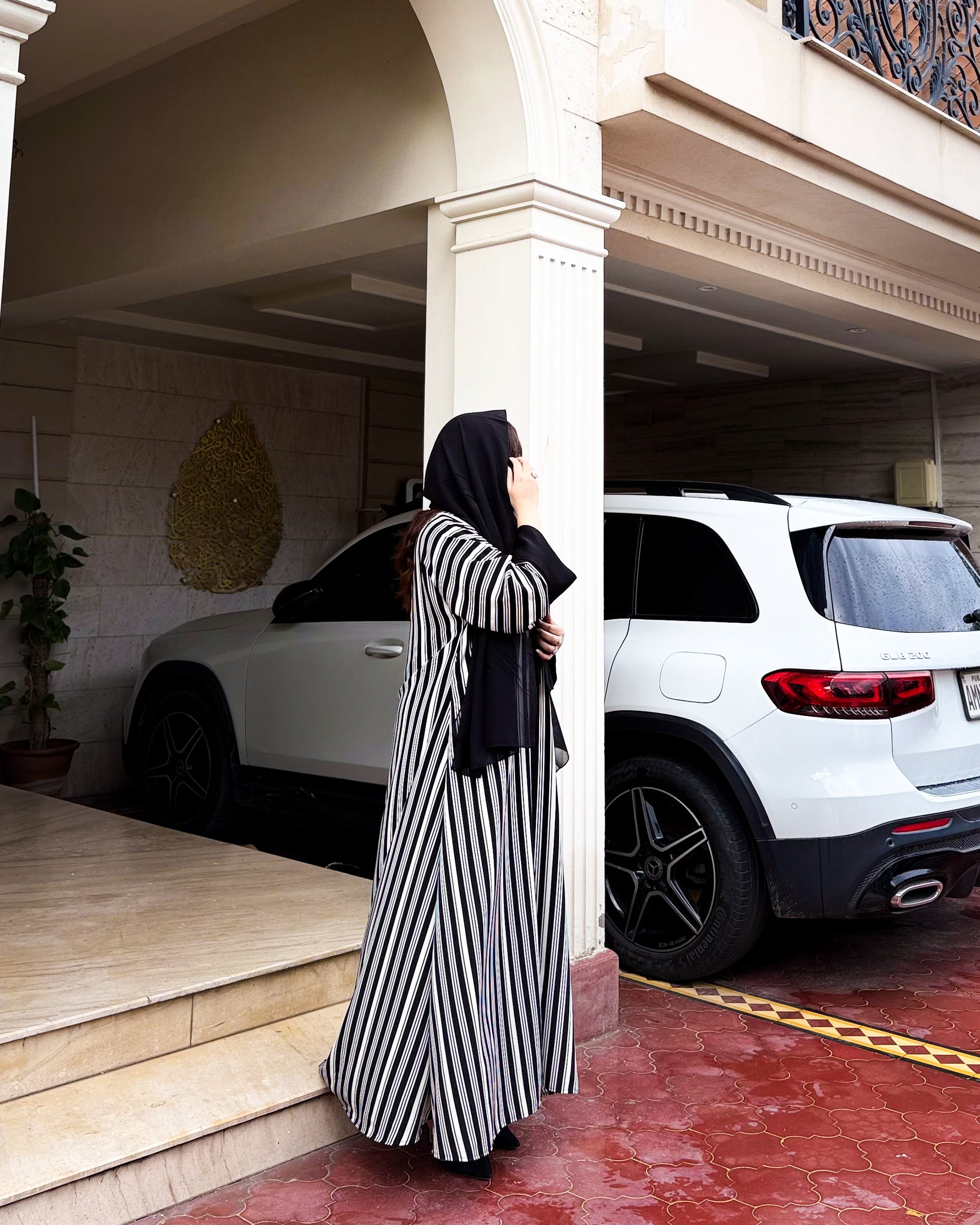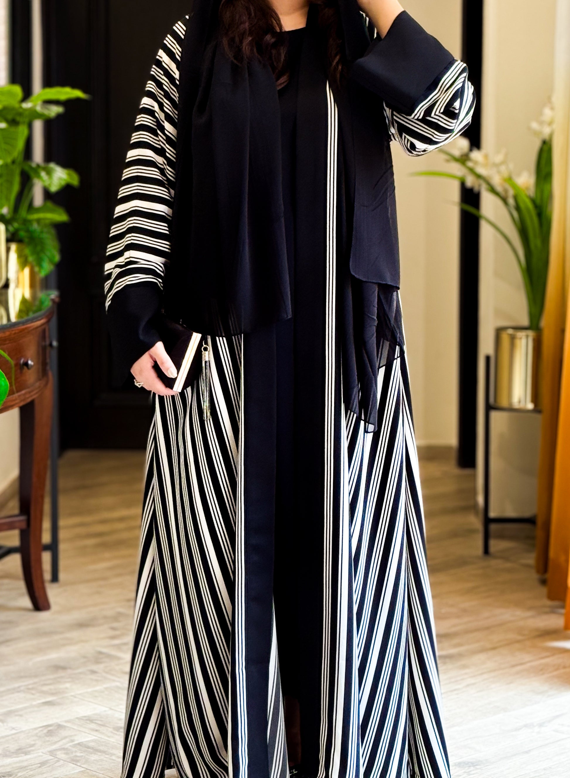 Keep it casual yet stylish with our Black & White Striped Georgette Abaya, designed for effortless everyday wear. Made from lightweight printed georgette, it offers a soft and breathable drape that’s perfect for warmer days.