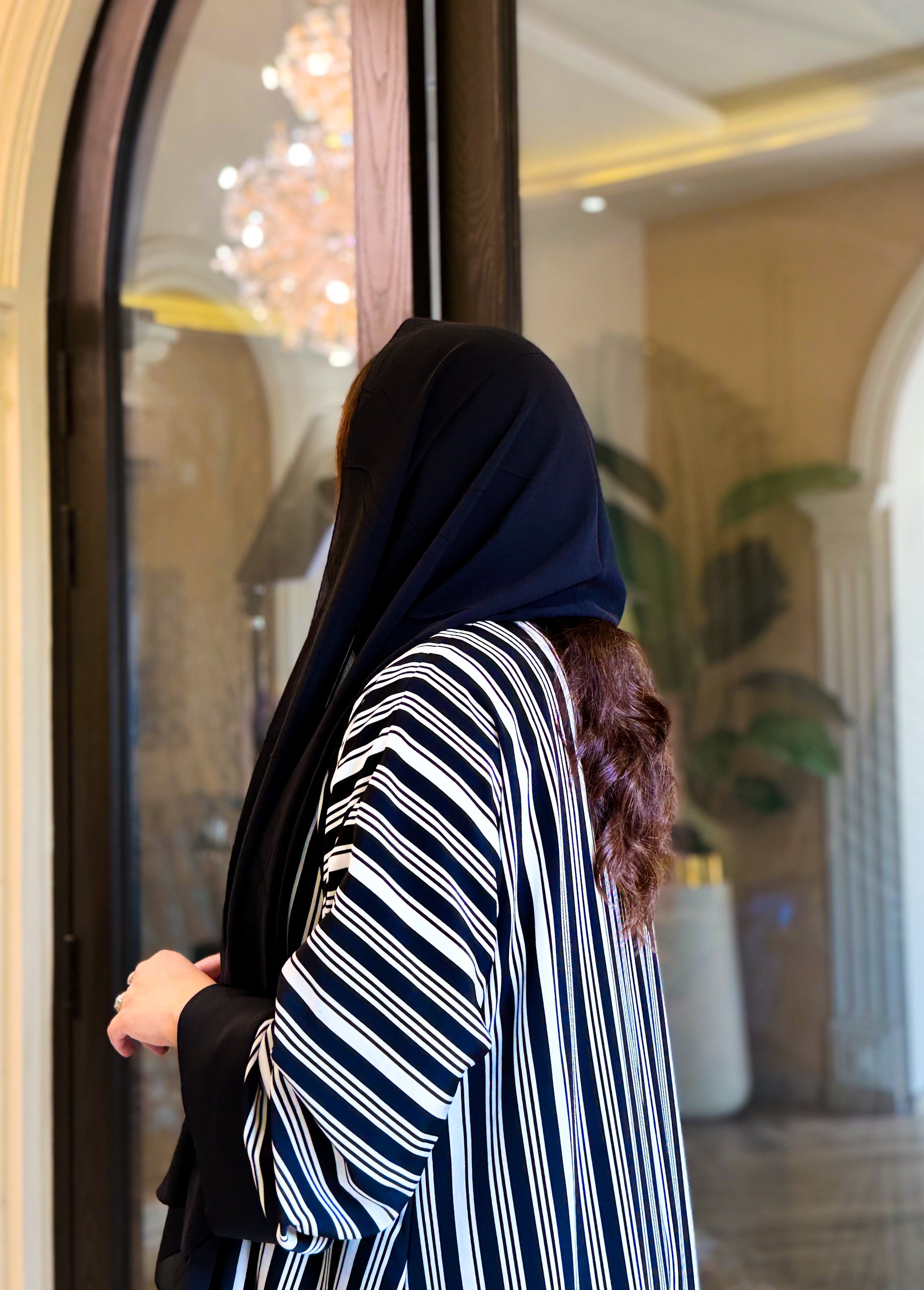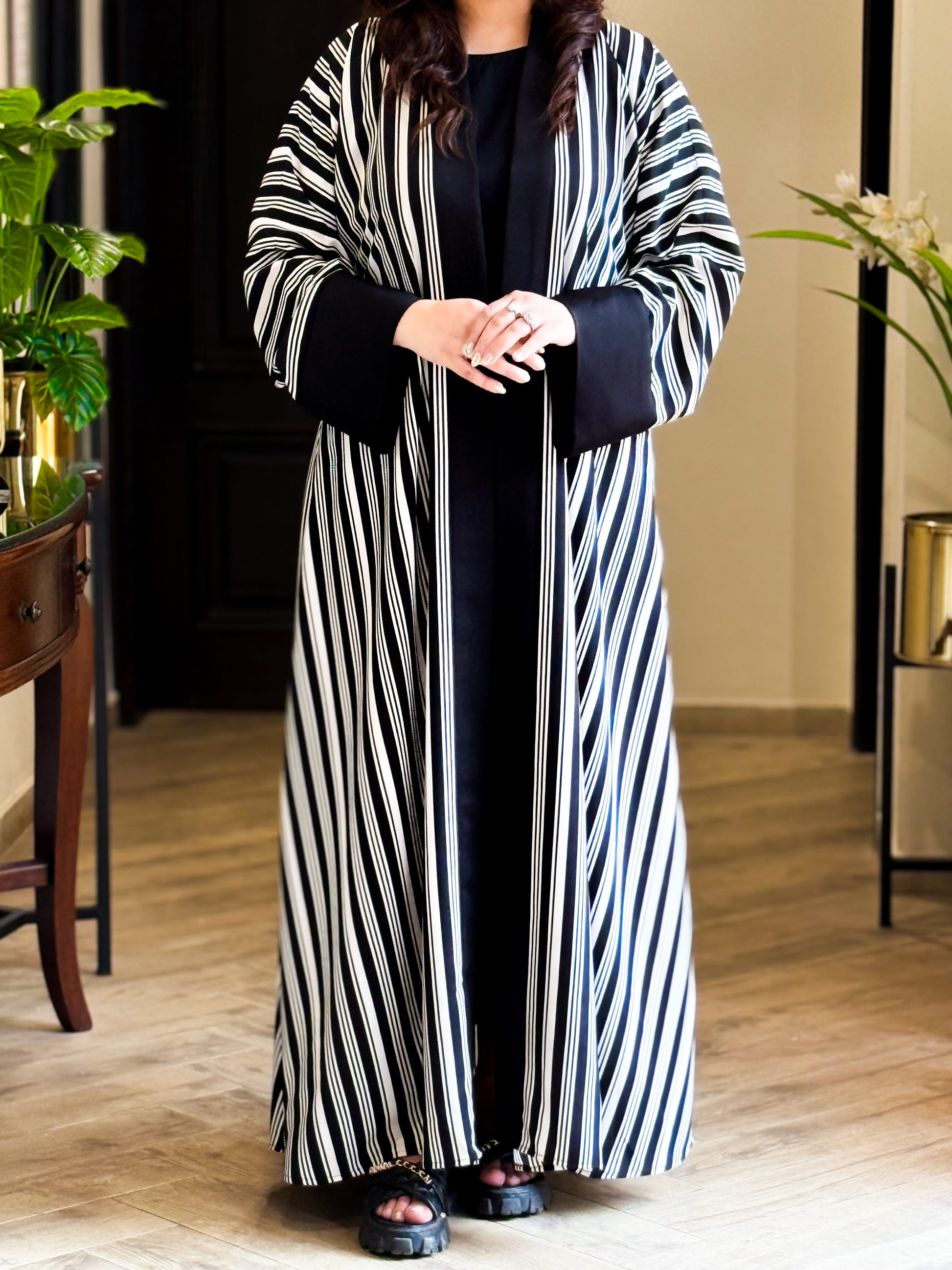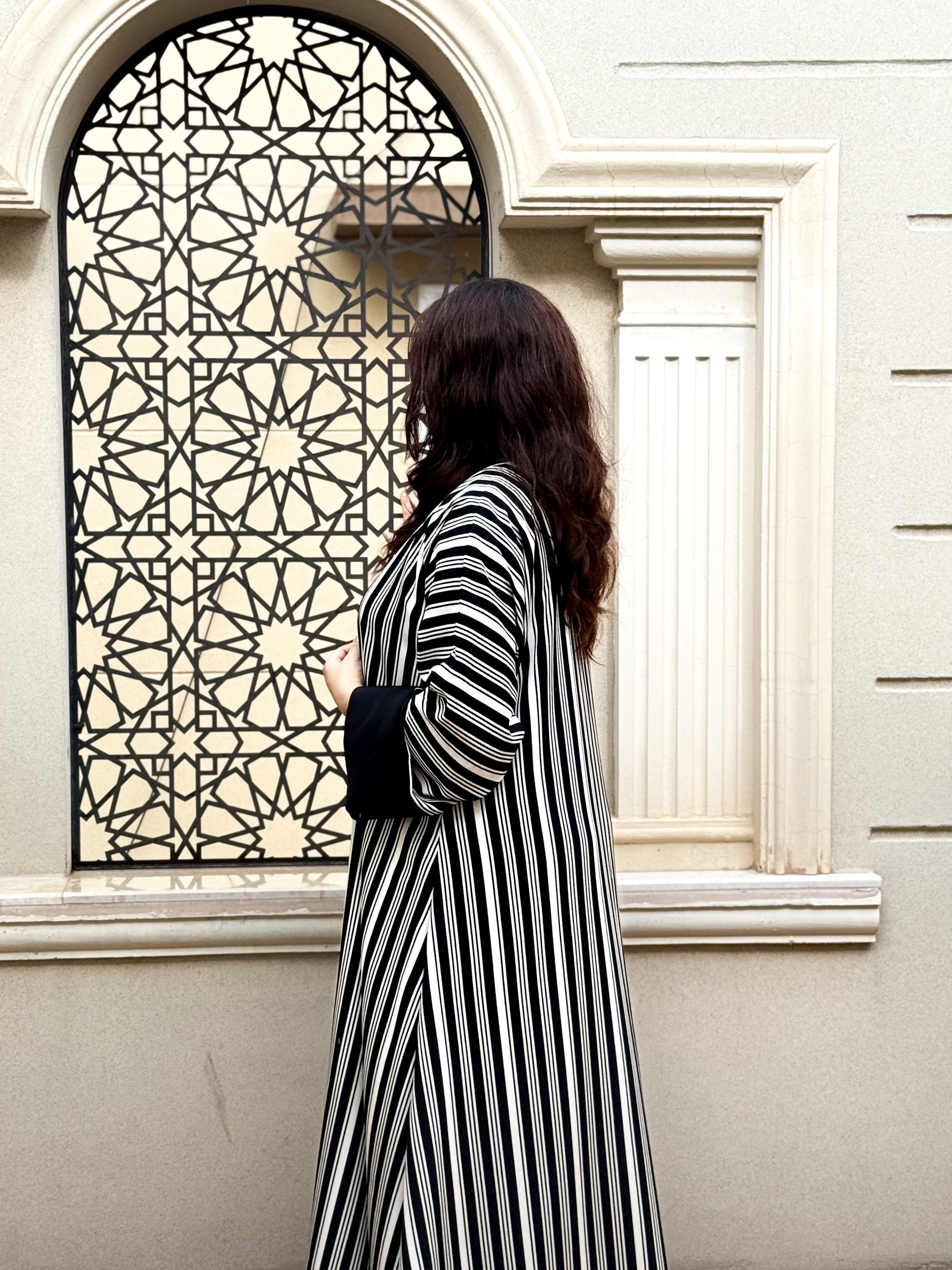 The vertical stripes create a relaxed, flattering look, while the solid black cuffs add a simple, neat finish. Ideal for casual outings, work, or daily wear, this abaya brings comfort and modest style together in one versatile piece.
